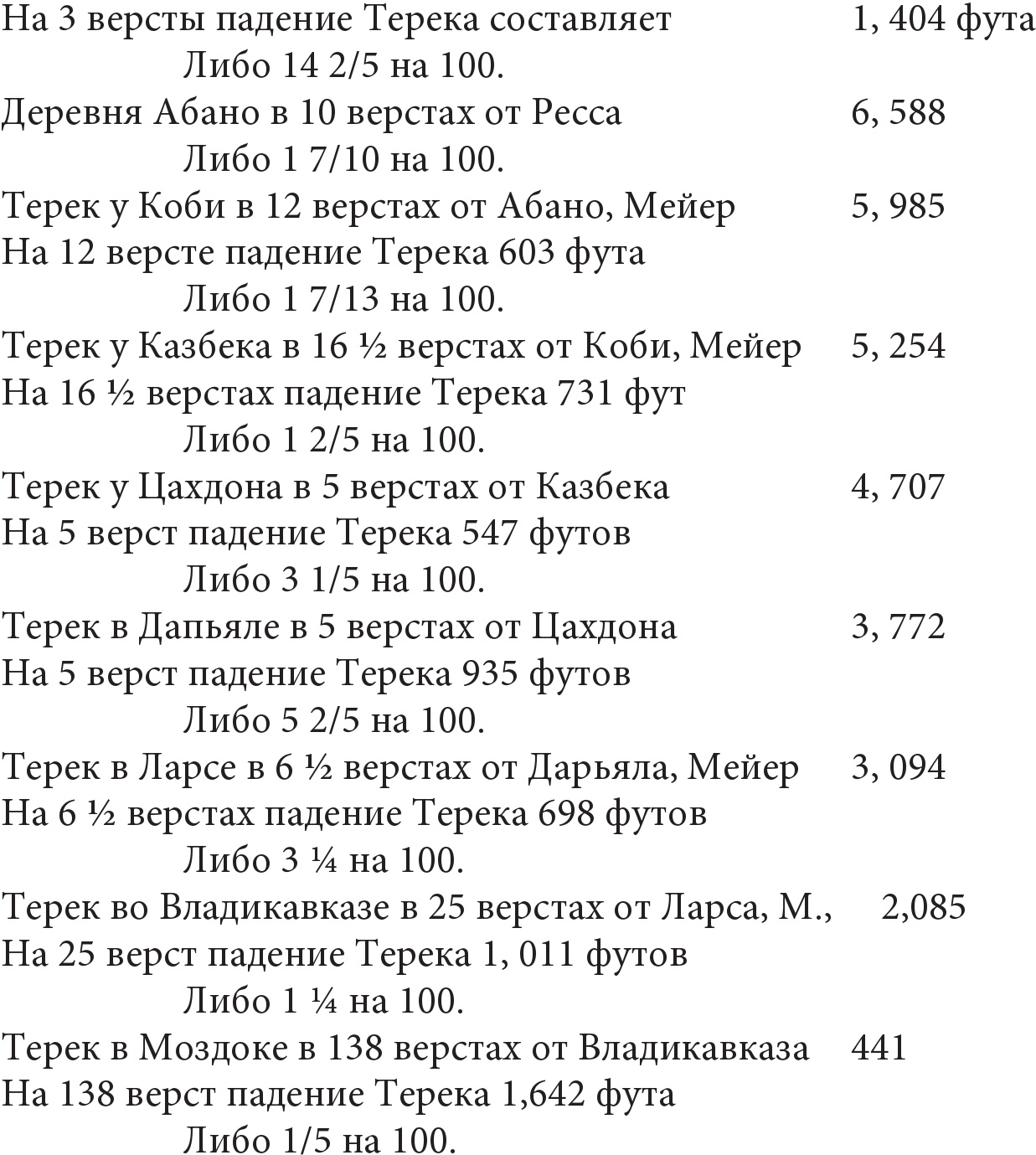 Только что мной составленные наблюдения по различным выравниваниям долины Терека помогут мне отыскать верный уровень в своем падении, исправив собственные наблюдения господ Энгельгардта и Паррота о верхней части течения этой реки.
