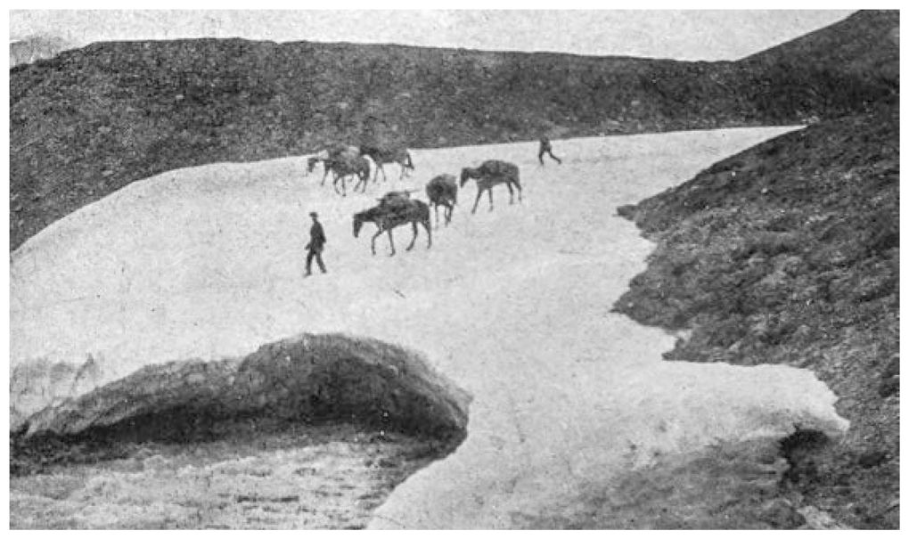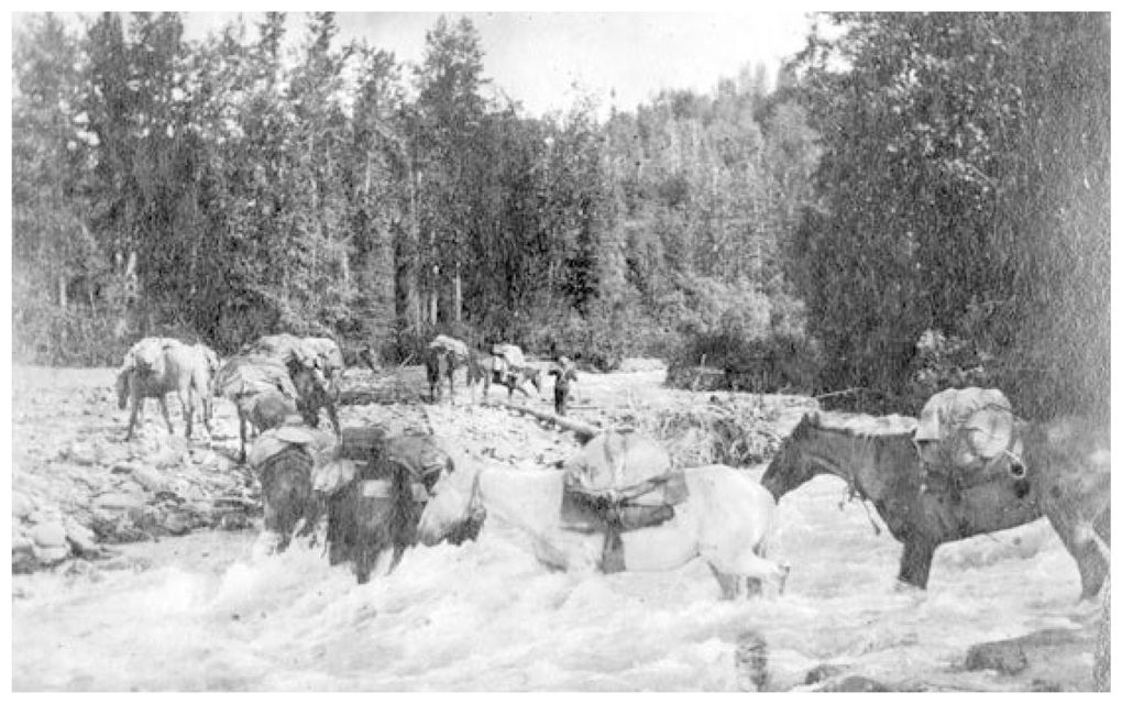 Лошади переходят реку вброд. Фредерик Кук пишет, что в попытках подойти к горе Мак-Кинли участники экспедиции постоянно промокали в ледяной воде. Фото Ф. Кука. Источник: Архив Центра полярных исследований имени Бэрда Университета штата Огайо