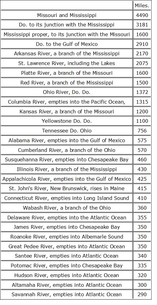 TravellingThe most general, the most rapid, the most agreeable, and, at the same time, the most dangerous, of American travelling is by steam boats. It will be as well to give the reader an idea of the extent of this navigation by putting before him the lengths of some of the principal rivers in the United States.