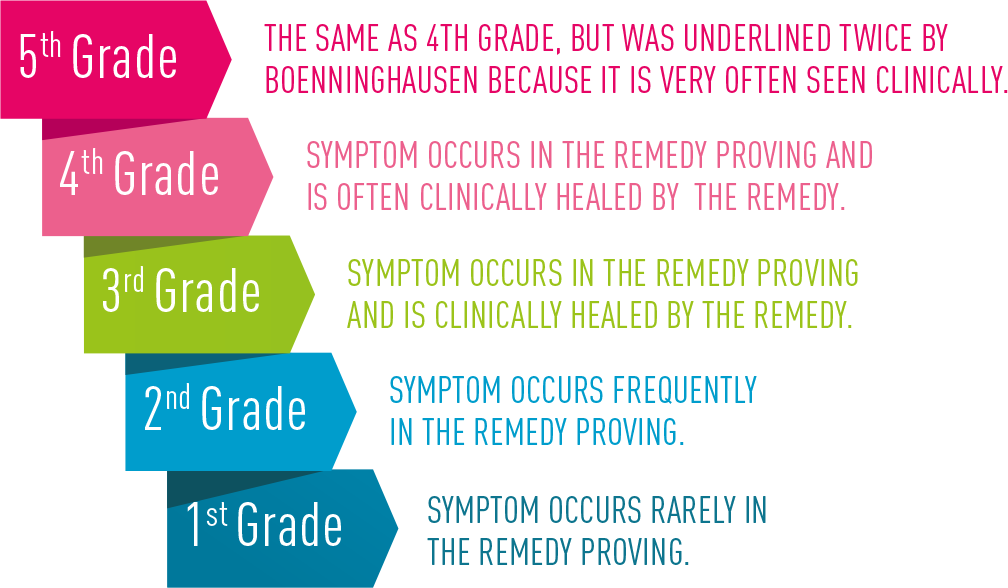 With many remedies, both poles of a polar symptom are covered, but in different grades. Boenninghausen said that a contradiction occurs when the patient symptom is observed in the 1st or 2nd grade with the opposite pole listed for the remedy in the 3rd, 4th, or 5th grade. In this case, the opposite pole (not the patient symptom) corresponds to the genius of the remedy. Boenninghausen found that such constellations hardly ever lead to healing, and indeed they are a contraindication for the remedy concerned. When checking unsuccessful prescriptions, made without regard to Boenninghausen’s rule, we frequently find contraindications that have been missed.