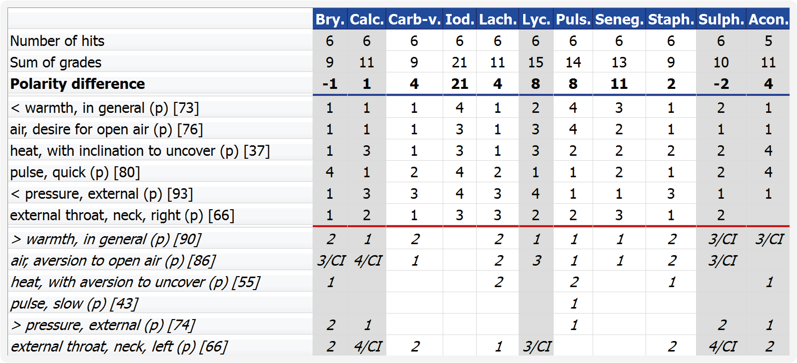 All six symptoms are covered by ten remedies, four of which have contraindications (Bry, Calc, Lyc, and Sulph – all shaded grey); these remedies are therefore discarded. Iodum has an outstanding polarity difference (PD) of 21, followed by Senega as the second possible remedy (PD 11). The other four remedies have, due to the much lower polarity difference, a significantly lower chance of healing the patient. The fact that Iodum stood out so strongly raised the suspicion that there was pathology of the thyroid gland. So the TSH (Thyroid Stimulating Hormone) level was determined, and was found to be massively lower than normal at 0.01 mU/l (normal: between 0.27 – 4.50), indicating a case of hyperthyroidism.