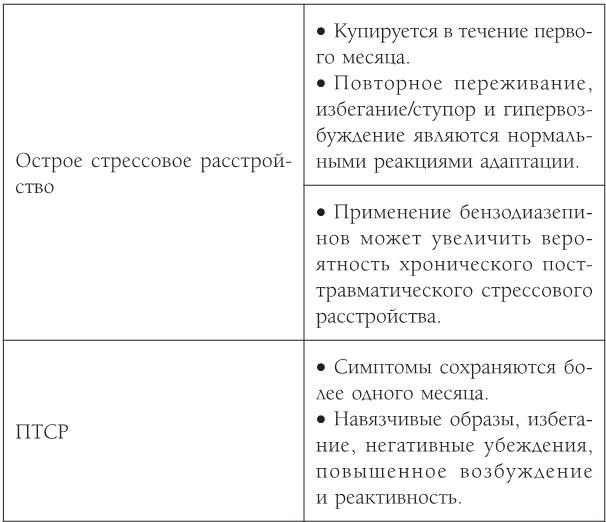 Десенсибилизация и переработка движениями глаз (EMDR) – это известный и часто применяемый метод лечения острого стрессового расстройства, рациональность его использования при острой травматизации подтверждена достаточным количеством исследований (Buydens, Wilensky, & Hensley, 2014). Дебрифинг стресса критических инцидентов (CISD) исторически являлся распространенным методом лечения при острой травматизации, особенно в случае коллективного происхождения, однако ее эффективность поставлена под сомнение, и в настоящее время протокол пересматривается с целью определения требуемого объема переживания, который будет благоприятным после травматического события (Wessely & Deahl, 2003). Проблематичным может являться как чрезмерная, так и недостаточная психотерапия. В ходе острой фазы травматизации необходимо также избегать приема некоторых препаратов, таких как бензодиазепины, поскольку их применение препятствует нормальной работе памяти и повышает вероятность развития хронического посттравматического стрессового расстройства (Guina и со-авт., 2015). Тем не менее проводятся новые исследования, показывающие, что применение стероидов во время острой фазы травматизации может быть полезным и способствует предотвращению развития хронического посттравматического стрессового расстройства (Rasmusson и со-авт., 2017).