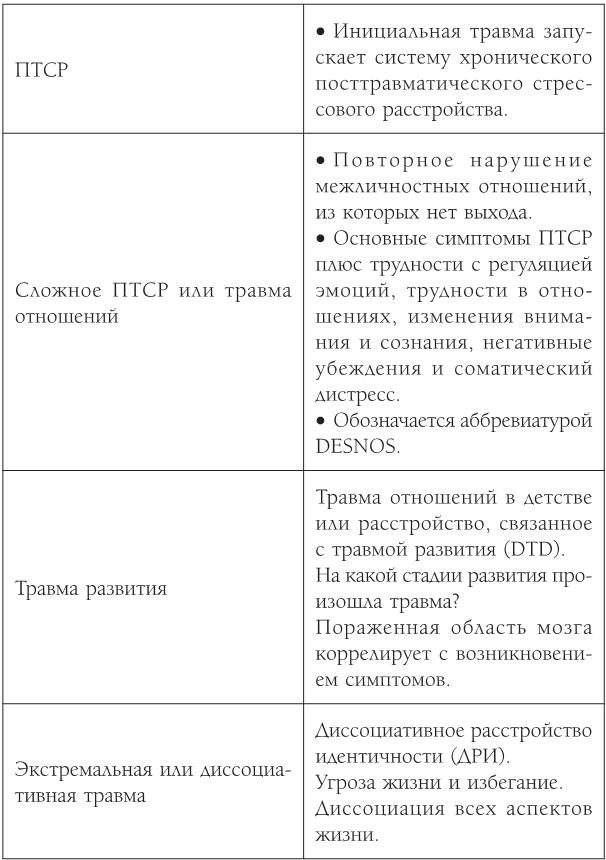 Все случаи травмы уникальны, и требуют индивидуального подхода в лечении. В этом разделе представлено краткое описание различных типов и категорий травм. Как правило, человек способен пережить одно травматическое событие или так называемое острое стрессовое расстройство, и в большинстве случаев имеется высокая вероятность полного выздоровления в течение одного месяца. Однако в случае нескольких травмирующих событий с высокой вероятностью можно говорить о хронической травме и симптомах посттравматического стрессового расстройства, которые могут продолжаться дольше одного месяца. В случае, если указанные травматические переживания обусловлены семейным насилием в детстве, у человека может развиться травматическое расстройство развития (DTD) или травма привязанности, а в случае сохранения или возникновения данных симптомов или нарушений во взрослом возрасте они способны привести к возникновению комплексного посттравматического стрессового расстройства (ПТСР) или травмы отношений. В более серьезных случаях после насилия в детском возрасте, а также после регулярного и/или серьезного насилия зачастую диагностируется диссоциативное расстройство личности (ДРИ), включающее несколько отдельных независимых компонентов.