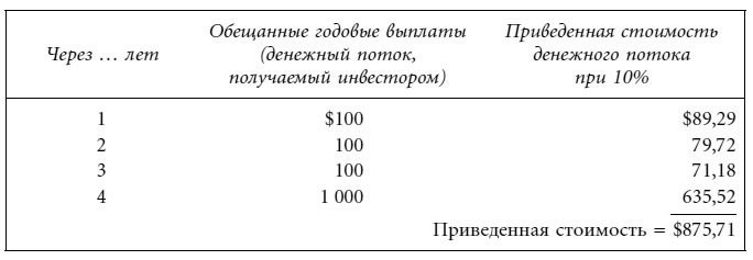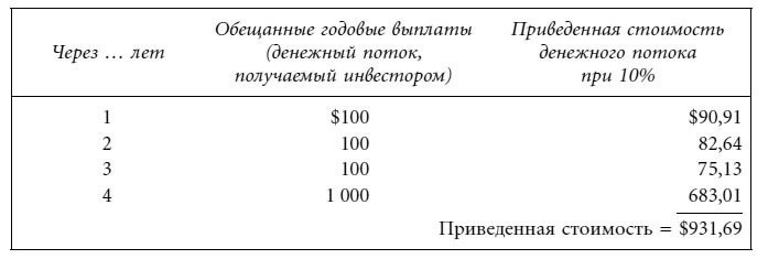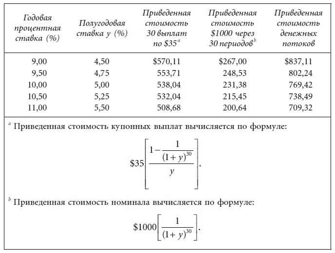 При полугодовой процентной ставке, равной 5 %, приведенная стоимость денежных потоков составляет $769,42. Таким образом, у равно 5 % и доходность к погашению (доходность, эквивалентная облигационной) – 10 %.