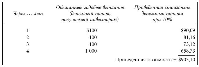 Вычисление доходности сводится к поиску такой процентной ставки, при которой приведенная стоимость денежных потоков окажется равной $903,10 (т. е. цене данного финансового инструмента). Подстановка процентной ставки 10 % дает следующий результат: