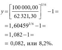 Продемонстрируем действие формулы на конкретном примере. Допустим, что финансовый инструмент, цена которого в настоящий момент составляет $62 321,30, должен через шесть лет принести $100 000. Доходность данной инвестиции, согласно формуле (3.3), будет равна 8,20 %, поскольку: