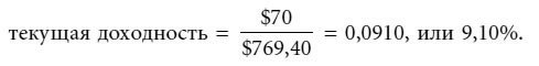 Так, текущая доходность 15-летней облигации с 7 %-ным купоном, номиналом $1000 и ценой $769,40 равна 9,10 %, поскольку: