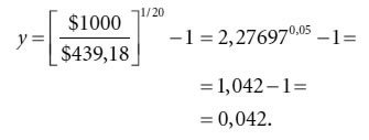 Так, для 10-летней облигации с нулевым купоном и номинальной стоимостью $1000, торгующейся по цене $439,18, у равно 4,2 %, поскольку: