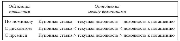Доходность к погашению – это мера, которая позволяет оценить не только текущий купонный доход, но и размер прибыли или убытка, ожидающих капитал инвестора, остающегося владельцем облигации до погашения. Кроме того, доходность к погашению принимает в расчет временные параметры денежных потоков. Отношения между купонной ставкой, текущей доходностью и доходностью к погашению приведены в таблице: