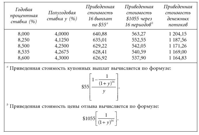 При подстановке искомого значения у в формулу (3.6) должно выполняться равенство правой и левой частей, т. е. приведенная стоимость денежных потоков до первой даты отзыва должна быть равна цене облигации ($1169). Процедура определения значения доходности к первому отзыву аналогична вычислению доходности к погашению. Приведенные стоимости при разных процентных ставках для периодов даются в таблице: