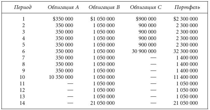 Для упрощения вычислений предположим, что купонные выплаты по всем облигациям совершаются в один и тот же день. Общая рыночная стоимость портфеля составляет $57 259 000. Денежные потоки для каждой из облигаций в портфеле, а также для портфеля в целом суммированы в таблице: