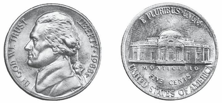 Рис. 1.11. Мельхиоровая пятицентовая монета, Филадельфия, 1988 г. Томас Джефферсон / Монтичелло. ANS 1988.144.8. Воспроизводится с разрешения Американского нумизматического общества.