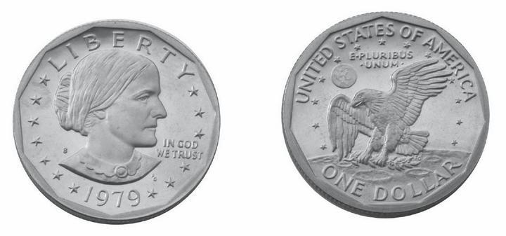 Рис. 1.12. Мельхиорово-медный доллар США, Сан-Франциско, 1979 г. Сьюзан Б. Энтони / Орел приземляется на Луну. ANS 1983.156.41. Воспроизводится с разрешения Американского нумизматического общества.