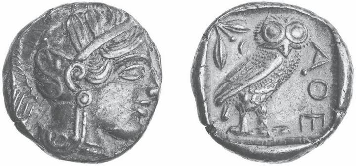 Рис. 1.14. Серебряная тетрадрахма), Афины, 450–400 гг. до н. э. Афина / Сова. ANS 1949.128.2. Воспроизводится с разрешения Американского нумизматического общества.