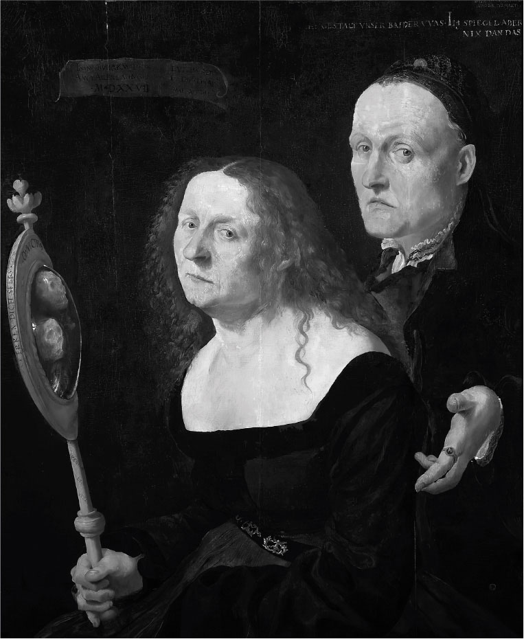 Еще один важный мотив чумной иконографии представлен в жанре ванитас (vanitas), аллегорически сообщавшем, что жизнь земная скоротечна и тщетна (рис. 4.2). Широкую популярность жанр ванитас приобрел после первой волны Черной смерти, затем, в XVIII в., он исчез с приходом эпохи Просвещения и окончанием второй пандемии. Традиционный христианский взгляд на бренность жизни выражен в книге Екклесиаста: «…суета сует, – всё суета! Что пользы человеку от всех трудов его, которыми трудится он под солнцем? Род проходит, и род приходит…»[9] На картинах ванитас часто изображены мирские блага, воплощающие всю самонадеянность человеческих устремлений: золото, музыкальные инструменты, научные фолианты, глобусы и изысканные одежды. Рядом с ними изображались черепа, погасшие свечи, песочные часы, отмеряющие ход времени, скрещенные кости, скелеты и лопаты – яркие символы основополагающей истины: человеческие достижения столь ничтожны, а жизнь – так коротка. Еще один пример – картина немецкого живописца Лукаса Фуртенагеля, на которой лица супругов средних лет в зеркальном отражении видятся черепами (рис. 4.3).