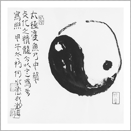 Эту работу выполнил специально для «Красоты физики» Хэ Шуйфа, современный мастер традиционного китайского искусства и каллиграфии, известный энергией и нежностью своей кисти и духовной глубиной образов природы, цветов и птиц. Перевод надписи звучит примерно так: «Двойная рыбка тайцзи – это сущность китайской культуры. Этот рисунок выполнил Хэ Шуйфа у озера в начале зимы».