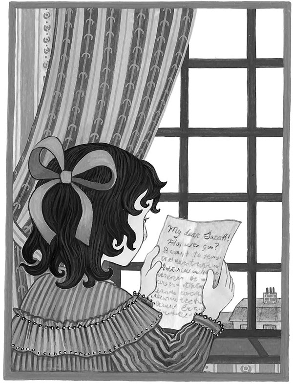 Когда Мариетта одела Сару в тёмно-синее форменное платье и завязала ей волосы тёмно-синей лентой, девочка подошла к Эмили, которая сидела на своём собственном стуле, и положила около неё книгу.