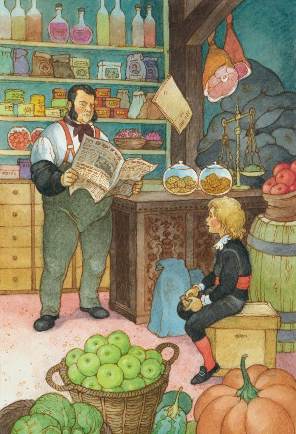 Он не вскарабкался, как бывало прежде, на высокий стул, а уселся на ящик с бисквитами, охватил руками колени и молчал так долго, что мистер Гоббс, наконец, вопросительно посмотрел на него из-за газеты.