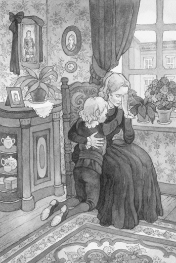 Но тут его любящее маленькое сердечко подсказало ему, что лучше всего обвить обеими руками ее шею, прижаться мягкой щечкой к ее щеке и целовать ее много, много раз; он так и сделал, а она опустила голову на его плечо и горько заплакала, крепко прижимая его к себе.
