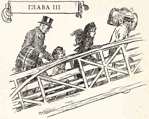 Потом – казалось, это случилось тотчас же – они очутились на пароходе посреди суеты и толкотни. Подъезжали экипажи, из них выходили пассажиры. Путешественники волновались из-за багажа, который ещё не прибыл и мог опоздать. Большие сундуки и ящики бросали вниз, таскали по палубе. Матросы развёртывали канаты и бегали взад и вперёд. Офицеры отдавали приказания. На палубу поднимались дамы, мужчины, дети и няни. Некоторые смеялись и казались весёлыми, другие печально молчали, третьи плакали, прижимая платки к глазам. Цедрик повсюду видел что-нибудь занимательное для себя. Он смотрел на груды верёвок, на собранные паруса, на высокие-высокие мачты, чуть не касавшиеся горячего синего неба, и уже начал составлять планы о том, как он заговорит с матросами и будет расспрашивать их о морских разбойниках.