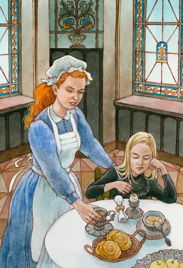 Через несколько дней, проведенных почти исключительно на свежем воздухе, она проснулась однажды утром очень голодная. Усевшись завтракать, она уже не оттолкнула чашки с презрительным видом, но сразу взяла ложку и стала есть; ела она до тех пор, пока чашка не стала пустой.