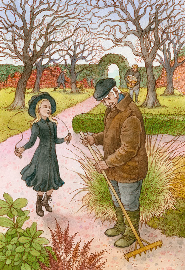 Зная, что Марта ушла, Мери почувствовала себя особенно одинокой. Она быстро выбежала в сад и сначала обежала десять раз вокруг фонтана; ей стало немного веселее. Потом она отправилась в фруктовый сад и там увидела Бена, который работал с двумя другими садовниками. Перемена погоды, очевидно, хорошо подействовала на него, и он сам заговорил с Мери.