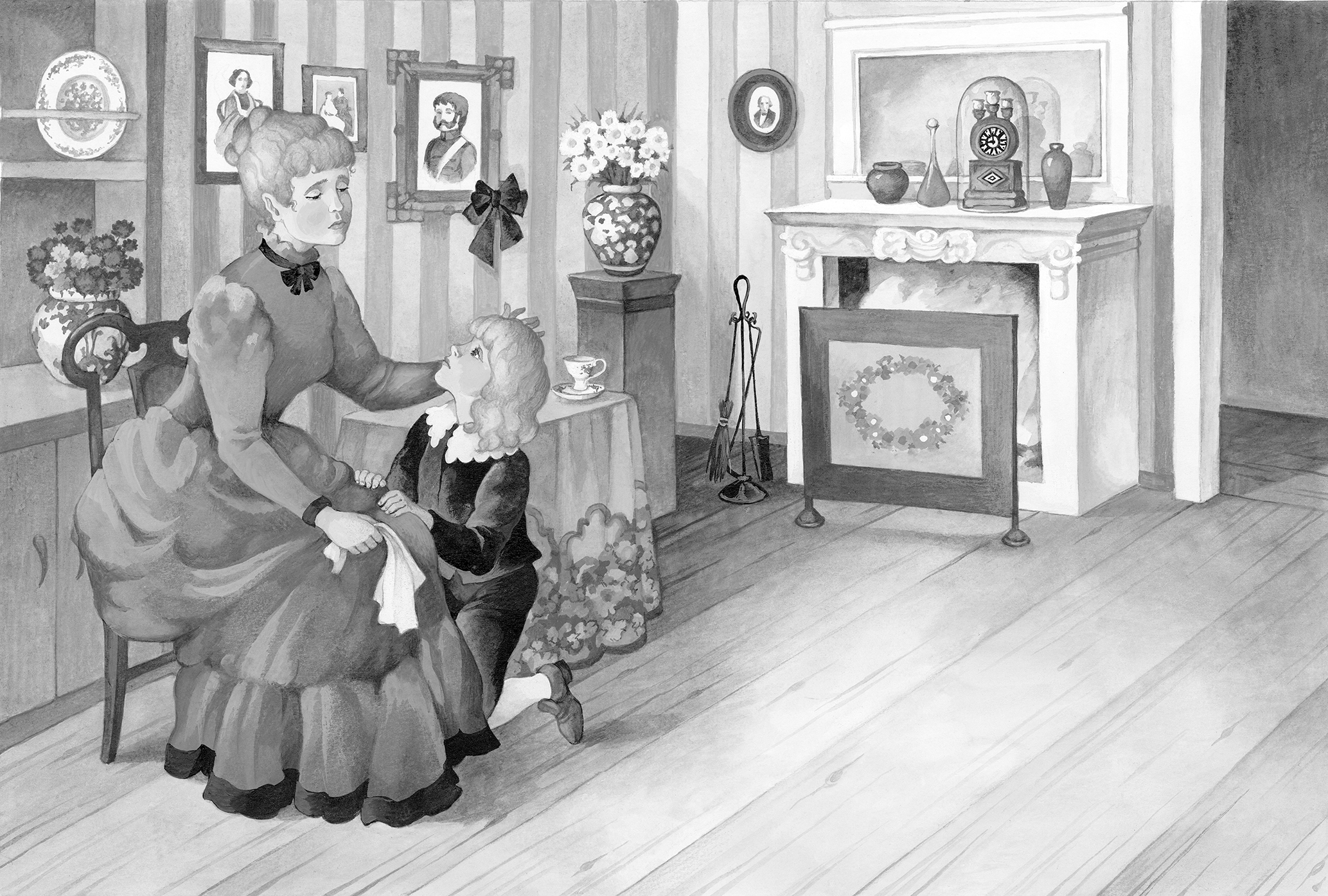 Но тут его любящее маленькое сердечко подсказало ему, что лучше всего обвить обеими руками её шею, прижаться мягкой щёчкой к её щеке и целовать её много-много раз; он так и сделал, а она опустила голову на его плечо и горько заплакала, крепко прижимая его к себе.