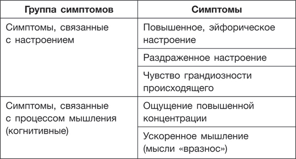 Мания часто развивается постепенно, и на ее полное формирование требуются недели. На первых этапах настроение медленно движется «вверх», так что люди полны приятных чувств и энергии. Завышенное ощущение благополучия и уверенности растет, постепенно переходя в эйфорию.