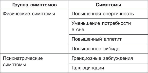 Мания предполагает чрезвычайно повышенное настроение, которое может быть эйфорическим или раздражительным. Это наиболее сильный и пугающий из симптомов биполярного расстройства. В маниакальном состоянии регулятор настроения выкручен на «высокое» (табл. 1.1). У многих людей с биполярным расстройством может вообще не наблюдаться эпизодов с полностью сформированной манией, однако наличие эпизода маниакального состояния подтверждает диагноз.