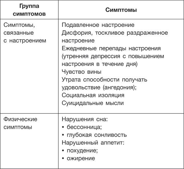Глубокая депрессия – состояние, для которого характерен чрезвычайно низкий уровень настроения, сопровождаемый ослаблением мыслительных способностей и памяти, утратой интереса к некогда любимым занятиям, нарушениями сна и аппетита, физической и умственной заторможенностью или возбуждением, а также довольно часто суицидными мыслями и поведением (табл. 1.2). Через депрессивное состояние проходят практически все люди с биполярным расстройством, причем для подавляющего большинства пациентов оно становится основным симптомом. Пациенты проводят больше времени, скорее, в депрессивном, чем в маниакальном состоянии.
