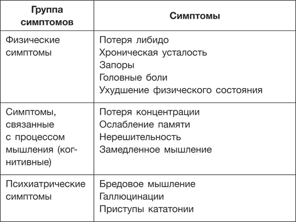 Страдает и аппетит. Как и в случае с нарушениями сна, отклонения вероятны в обоих направлениях: пациент ест или слишком много, или слишком мало. В таком случае в период депрессии будет наблюдаться либо потеря, либо повышение массы тела. Также вполне вероятна утрата либидо – симптом, более понятный с точки зрения общей утраты удовольствий от жизни.