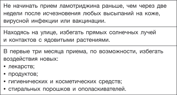 Учитывая то, что слабая кожная реакция может развиться не только на фоне применения лекарственных препаратов, но и на многие другие агенты, важно напомнить пациенту перед началом терапии ламотриджином о необходимости отслеживать реакцию на другие вещества. Если высыпания появляются в ответ на прием ламотриджина, возникает терапевтическая дилемма: является ли этот случай полиморфной эритемой или слабой кожной реакцией? Здесь есть опасность без причины оставить пациента без терапии, отменив потенциально эффективный препарат. Именно поэтому лица, начинающие лечение ламотриджином, должны придерживаться протокола, разработанного в Стэнфордском университете (табл. 3.4) с целью профилактики сыпи иной этиологии. У меня была пациентка, которой предыдущий специалист отменил прием ламотриджина из-за высыпаний, впоследствии определенных, как реакция на сумах. Она без проблем смогла возобновить прием препарата и довести его до терапевтической дозы. А я обязательно предупреждаю своих пациентов, назначая им ламотриджин: «Никакой работы в саду, пеших прогулок или новых ресторанов, шампуней и стиральных порошков. Не оставайтесь на солнце и заботьтесь о коже!»
