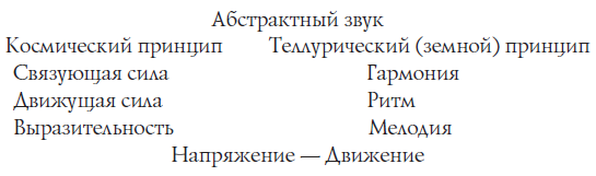 Нам представляется важным вопрос о скрытых фактах, связанных с музыкой, на которых основывается вся наша жизнь. Философская литература изобилует доказательствами непосредственного влияния музыки на человека. Натурализм ХVIII столетия, продолжающий жить в эстетике Й.Г. фон Кирхмана и Фридриха фон Хаусэггера, требует возобновления, поскольку в своих верных выводах основывается на первопричинах, первозданных звуках; и корректировки, так как удаляется от них в своих слишком рассудочных выводах. Главные элементы, определяющие внутреннюю взаимосвязь жизни и музыки, – напряжение и ритм. Эти музыкальные понятия соответствуют человеческой природе. Ритм не выражается в шаге, как полагал Хаусэггер, поскольку у него отсутствует элемент напряжения. Напряжение присутствует в процессе дыхания, в наполнении легких и в расслабляющем выдохе – процессе, приведшем к первому мелодичному крику радости, ликованию и последующему пению с переливами. Ритм проявляется в напряженном биении сердца с его разнообразными колебаниями – например, диастола в три-четыре раза длиннее систолы[11]. Напряжение и ритм – это процессы движения как в музыке, так и в жизни. Изобразительные силы музыки – это движущие силы жизни, они скрываются за музыкальным ритмом. Их возрастающие интенсивность и сложность отражаются в полиритмии[12] искусства (например, в джазе), развитие движущих сил человека и музыки протекает пропорционально. Гармония – это связующая сила жизни, которая сглаживает противоречия и объединяет общее. Установление гармоничных связей является смыслом и целью как человечества, так и музыки. Мелодия, третий основной элемент музыки, – это сила субъективного выражения в жизни, она представляет собой воплощение и проявление индивидуальности. Если бы философия натурализма придерживалась этих определений, то в своих последующих выводах она сумела бы избежать некоторых заблуждений. Наша философия музыкальной трансцендентности усматривает во всех этих признаках взаимосвязи жизни и музыки не причины и не первичные факты, приведшие к возникновению земной музыки, а воздействия высших духовных порядков. Речь об этом пойдет в последующих разделах. Для наглядности попробуем это изобразить в виде схемы.