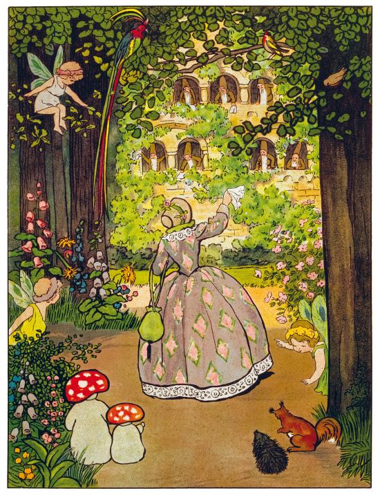 Стоит пройти через ворота, ведущие в Сказочную страну, как ты оказываешься посреди вечнозелёного волшебного леса. Старая серая крепость с семью оконцами взмывает из чащи ввысь. Из каждого оконца выглядывает сморщенное лицо с седой бородой. Это и есть семь верных гномов, которые раньше жили за семью горами, это им прислуживала Белоснежка, королевская дочь с чёрными как смоль локонами.