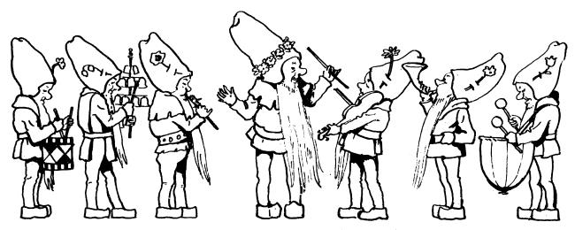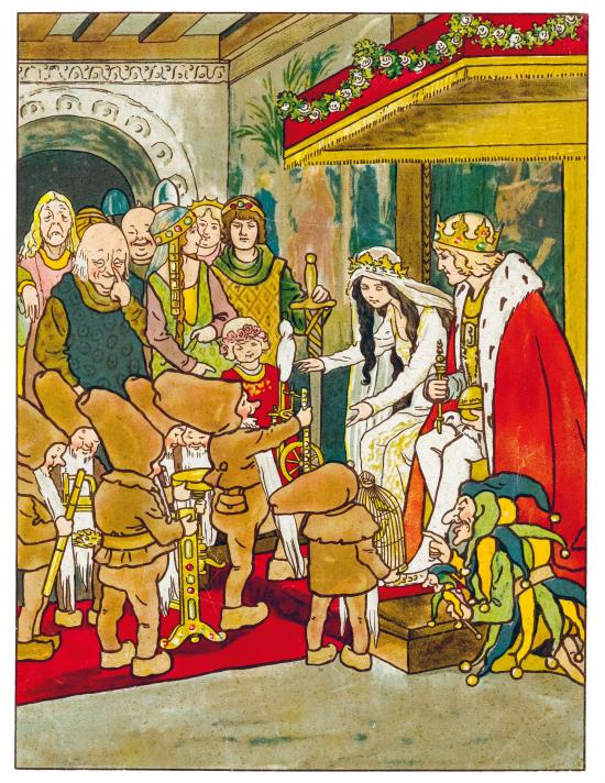 Главный распорядитель в королевском дворце с недовольным видом указал гномам на дальний угол украшенного золотом зала. Там они и разместились. Когда молодожёны с их разодетой свитой вышли из церкви и ступили в украшенный цветочными венками зал, им навстречу полились нежные звуки милых сердцу мелодий. Прекрасная невеста прислушалась к ним, и её ясное личико расцвело розовым румянцем.