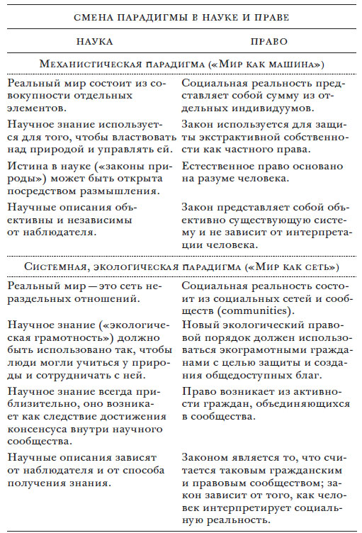 Правовой режим – самый главный проводник, посредством которого наше мировоззрение получает воплощение в действии, имеющем общественное значение. Это значит, что законы, устанавливаемые людьми, также можно рассматривать как деятельность, в которой воплощаются наши новые идеи и ценности. Нам следует переосмыслить наши законы, их связь с экологическими законами, по которым живет планета. Этому переосмыслению, своего рода коперниканскому перевороту в праве, должна нас научить сама природа; сообществам людей и долгосрочному, стратегическому видению будет отведено центральное место. Мы должны перейти от «механизма закона» к «экологии закона». В последующих главах мы подробно изучим природу такого изменения парадигмы в праве и сравним это с теми изменениями мировоззрения, которые происходят сейчас в науке. Ключевые пункты нашей аргументации суммированы в нижеследующей таблице, которую можно рассматривать как определенного рода краткое содержание книги.