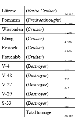 Many of the destroyers had fired all their torpedoes, and these craft were used for emergencies. They were very necessary, as the disabled cruisers Rostock and Elbing were abandoned and blown up, and these destroyers did good service in taking off the crews. They also rescued the crew of the disabled Lützow, which was towed through the darkness until she was so down by the head that her screws spun in the air. She was abandoned and destroyed by a torpedo at 1.45 A.M. Admiral Scheer cites the fact that these events could happen, without disturbance by the enemy, as “proving that the English Naval forces made no attempt to occupy the waters between the scene of battle and Horn Reef.” (S)