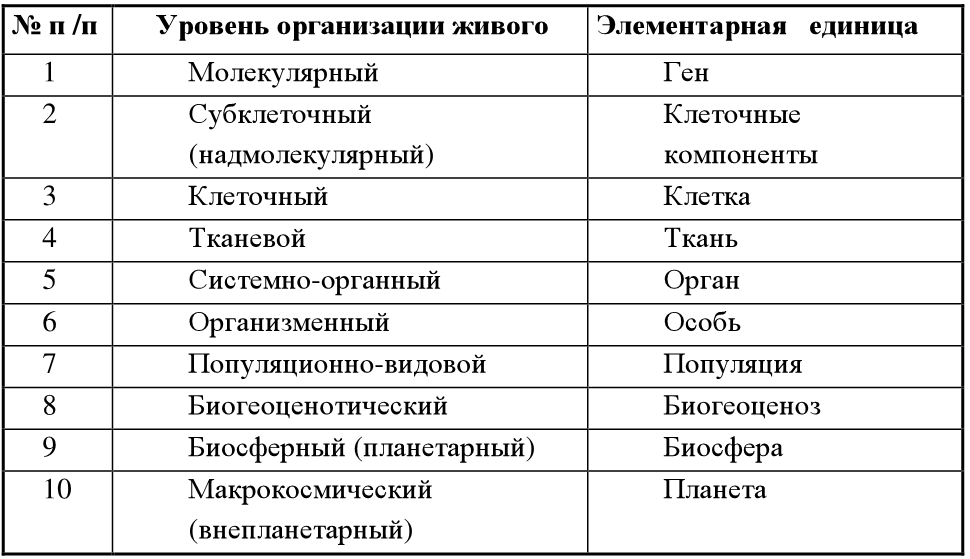 В настоящее время принято выделять 10 уровней организации живого.