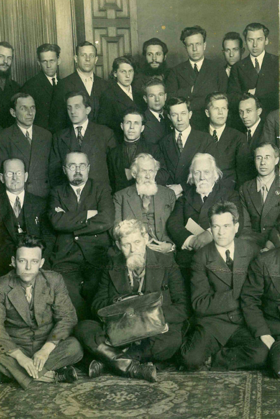 Встреча участников полярных геологических экспедиций с академиками А.П.Карпинским, В.А.Обручевым, А.Д.Архангельским и М.М.Титяевым (второй ряд), 1936 год. Г.А.Кремчуков – в третьем ряду третий справа (фото из личного архива Г.А.Кремчукова)