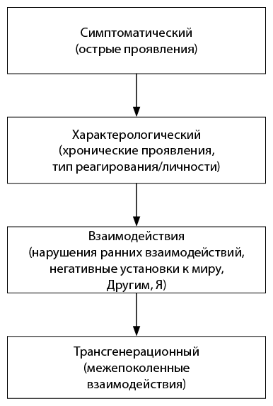 Можно выделить следующие уровни проблемы: симптоматический, характерологический, организации личности, взаимодействия, трансгенерационный.