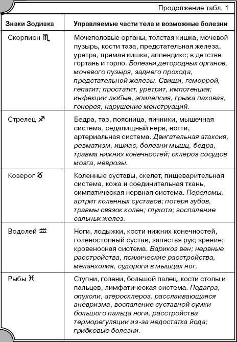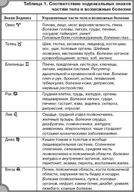 Таблица 1. Соответствие зодиакальных знаков частям тела и возможные болезни