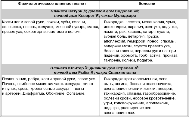 Таблица 2. Влияние планет на органы человеческого тела и возможные болезни