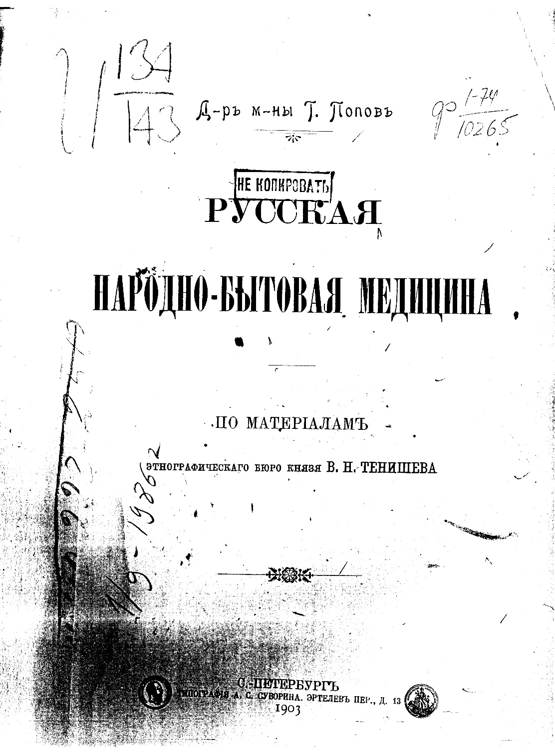 Когда автору этих строк впервые в руки попалась ксерокопия этой книги, больше всего он был изумлён штампом «Не копировать», красовавшемся на её титуле. Можно было бы, конечно, сделать скидку на придирки царских цензоров, которые таким образом пытались защитить тогдашних российских граждан от влияния суеверий. Однако какие в 1903 году были средства копирования? Скорее всего, именно стараниями советских цензоров на книге была поставлена эта несмываемая печать, грозящая ослушавшимся всеми ужасами Гулага. Но после прочтения монографии д-ра Г. Попова автор этих строк остался в еще большем недоумении – как и кому могло помешать, какую идеологию способно было оскорбить это скромное этнографическое исследование, посвященное быту и поверьям дореволюционного русского крестьянства? За что эту книгу продержали под запретом почти целый век? И лишь сейчас, когда с момента публикации этой книги прошло без малого 110 лет, и на проделанный нашей страной и нашей российской медициной путь стало возможным взглянуть с высоты более чем вековой давности, мне стало понятно, что больше нельзя, невозможно, и даже преступно далее скрывать от нашего народа этот важнейший и буквально энциклопедический труд давно забытого русского врача-интеллигента, столь старательно запрещавшийся прошлыми поколениями русского чиновничества.