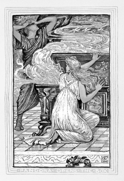 По просьбе Эпиметея Пандора раскрыла принесенный ящик, и весь сонм заключенных там несчастий мгновенно хлынул оттуда и распространился по всей земле. На самом дне сосуда была заключена надежда, согревающая в минуты скорби сердца людей, но Пандора, по знаку громовержца, захлопнула крышку, не дав ей вылететь.