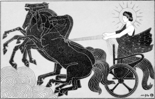 Гелиос – бог Солнца – на колеснице, запряженной крылатыми конями, взлетает на небо. Рисунок Хисуи Сугиура. 1918