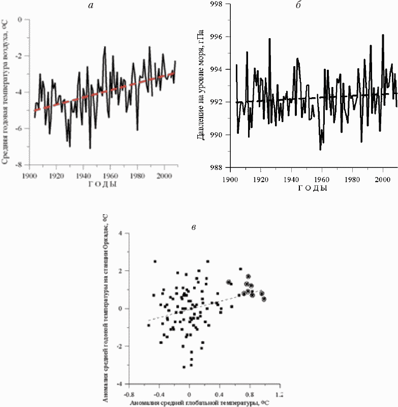 Рис. 1. Межгодовые изменения среднегодовых значений приземной температуры воздуха (а) и давления на уровне моря (б) по данным станции Оркадас (Южные Оркнейские острова) за период 1903–2009 гг. и оценка связи аномалии средней глобальной температуры воздуха за период 1880–2009 гг. по данным архива GISS (США) с аномалией температуры воздуха на станции Оркадас (в). На рис. (в) кружками отмечены данные за последнее десятилетие (2000–2009 гг.)