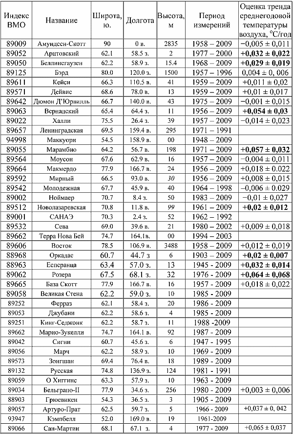 Оценки трендов для остальных станций и регионов Южной полярной области существенно зависят от длительности анализируемого периода, источника данных (различные справочники, метеорологические телеграммы, архивы данных), полноты и контроля качества информации, методов расчета и осреднения. Указанные причины объясняют значительный разброс оценок и выводов о текущих изменениях климата Антарктиды, полученных в последние годы (Monaghan at al., 2008, Данилов и др., 2003, Лагун и др., 2006, Kejna, 2003, Turner et al., 2006).
