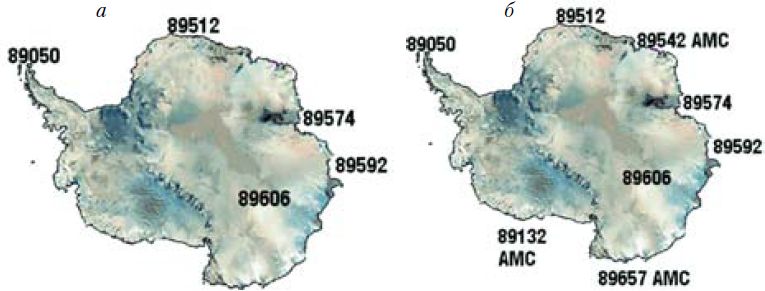 Рис. 2. Размещение российских антарктических станций до МПГ (а) и в период МПГ (б). Обозначения: 89050 – Беллинсгаузен, 89512 – Новолазаревская, 89774 – Прогресс, 89592 – Мирный, 89606 – Восток, 89542 АМС – Молодежная, 89657 АМС – Ленинградская, 89132 АМС – Русская