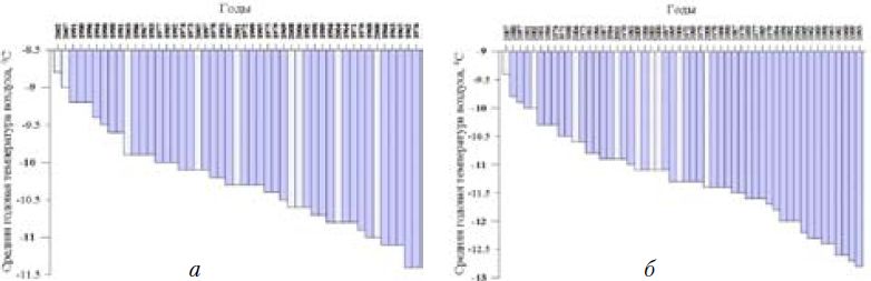 Рис. 4. Распределение средних годовых значений температуры воздуха на станции Амундсен-Скотт (а) и Восток (б) за период инструментальных наблюдений по убыванию величины