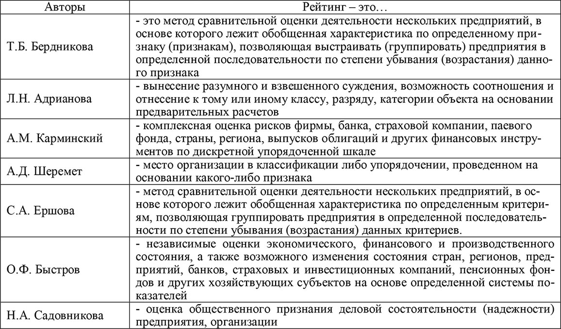 В экономической науке существует несколько точек зрения на понятие «рейтинга» (табл. 1).